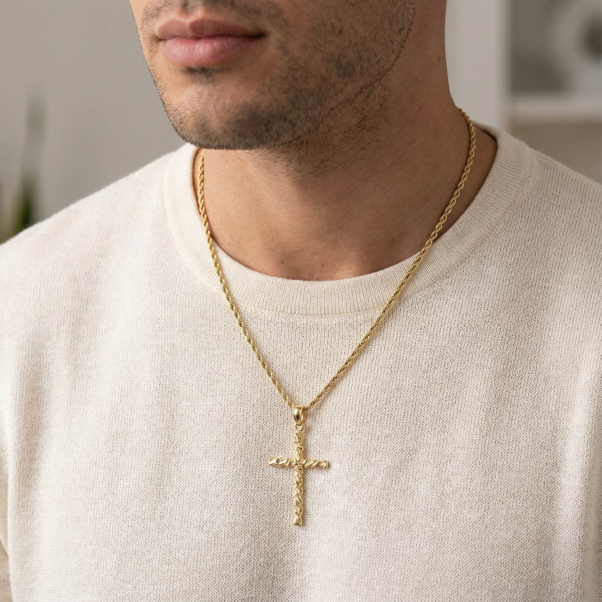 Die detailreiche, nuggetartige Verarbeitung verleiht diesem Kreuz einen unverwechselbaren, handgefertigten Charakter, der es von Massenware abhebt. Ob als tägliche Erinnerung an den Glauben oder kombiniert mit anderen Anhängern für einen individuellen Look – dieses Schmuckstück bereichert jede Schmucksammlung mit Wärme und Bedeutung. Die polierte Oberfläche sorgt für einen schönen Glanz auf der Haut, und die kompakte Größe von 30 mm macht es perfekt für den Alltag, ohne das Dekolleté zu erdrücken.