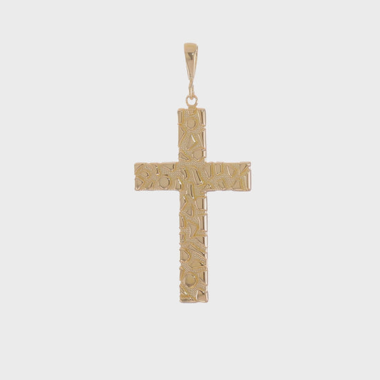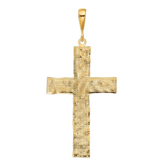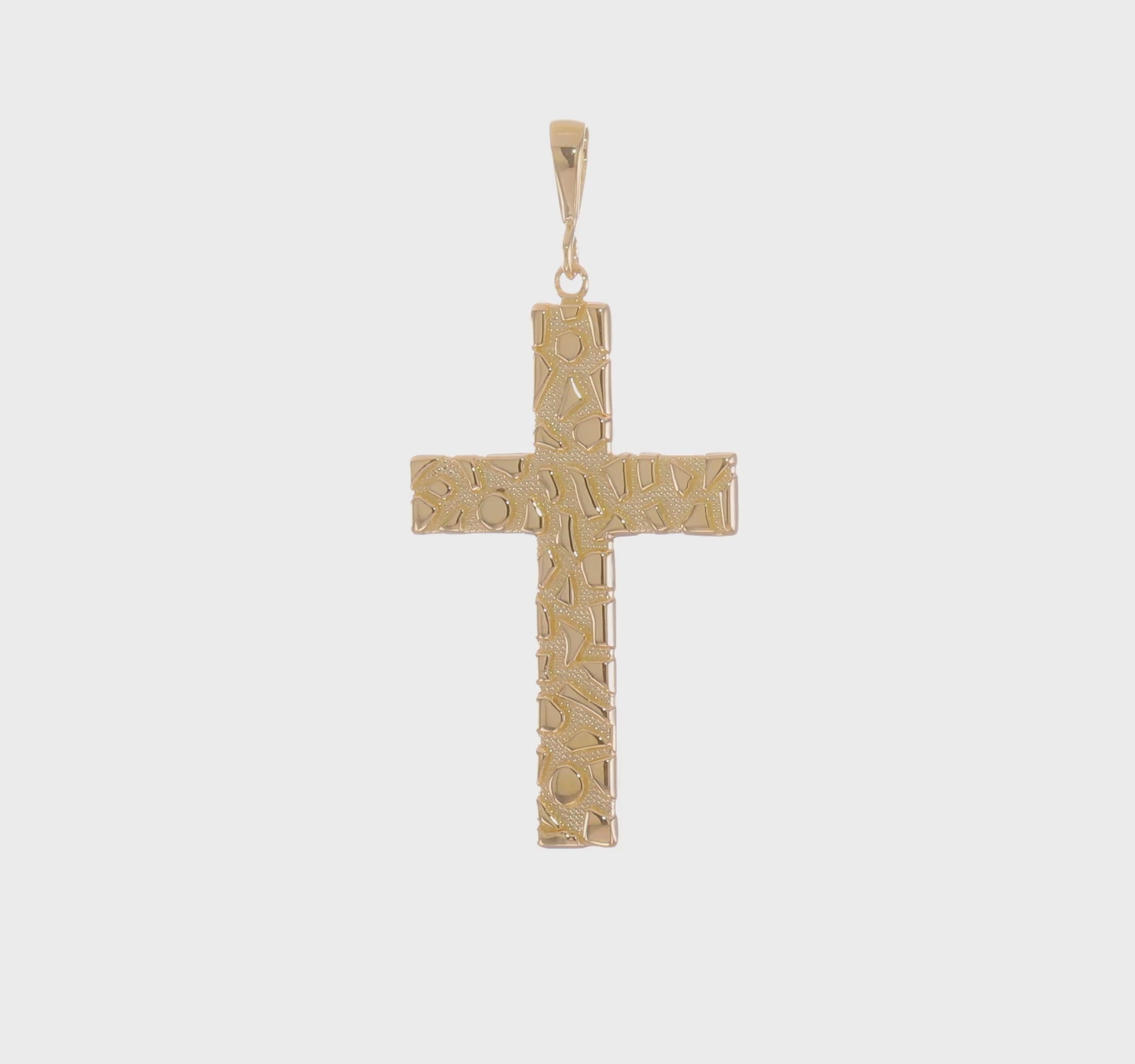 Setzen Sie ein starkes Zeichen Ihres Glaubens mit diesem markanten Kreuzanhänger aus 14-karätigem Gelbgold. Die reich strukturierte Oberfläche fängt das Licht aus jedem Winkel ein und erzeugt ein faszinierendes Funkeln, das spirituelle Hingabe und zeitlosen Luxus vereint.