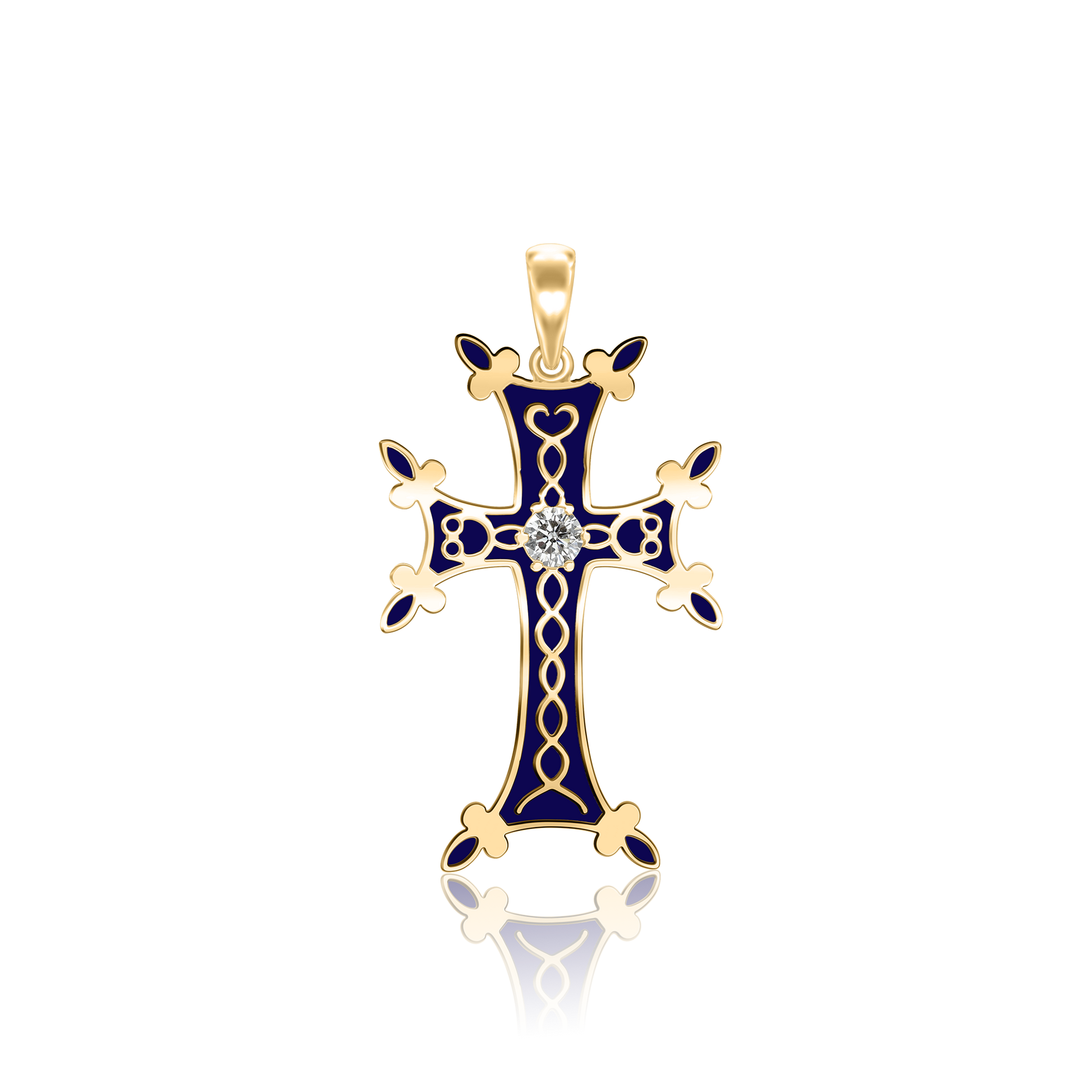 Armenisches Kreuz-Anhänger mit Zirkonia und dunkelblauer Emaille in 18 Karat Gelbgold