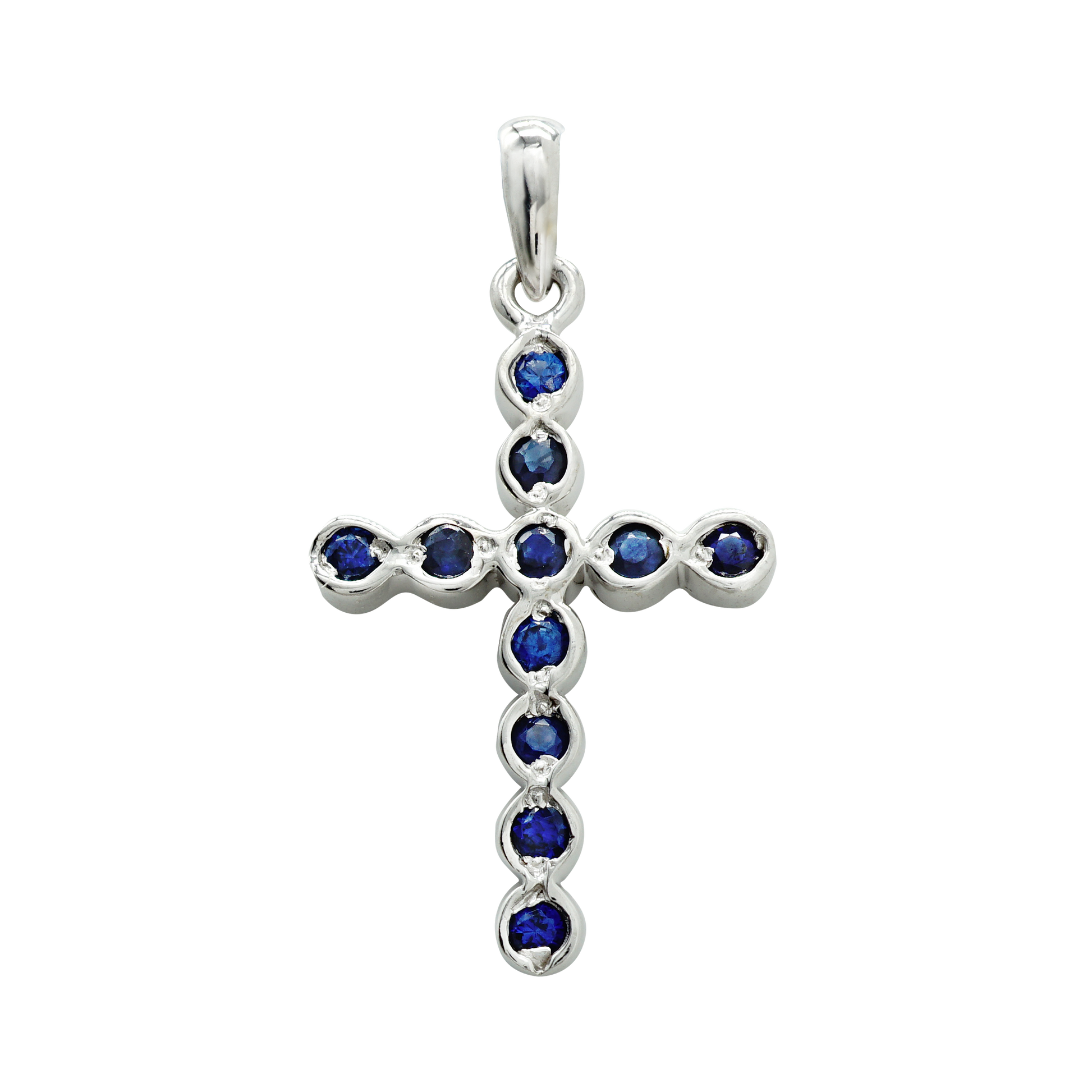 Klassischer Kreuzanhänger mit Saphiren in 14-karätigem Weißgold, gefasst in einer Lünette