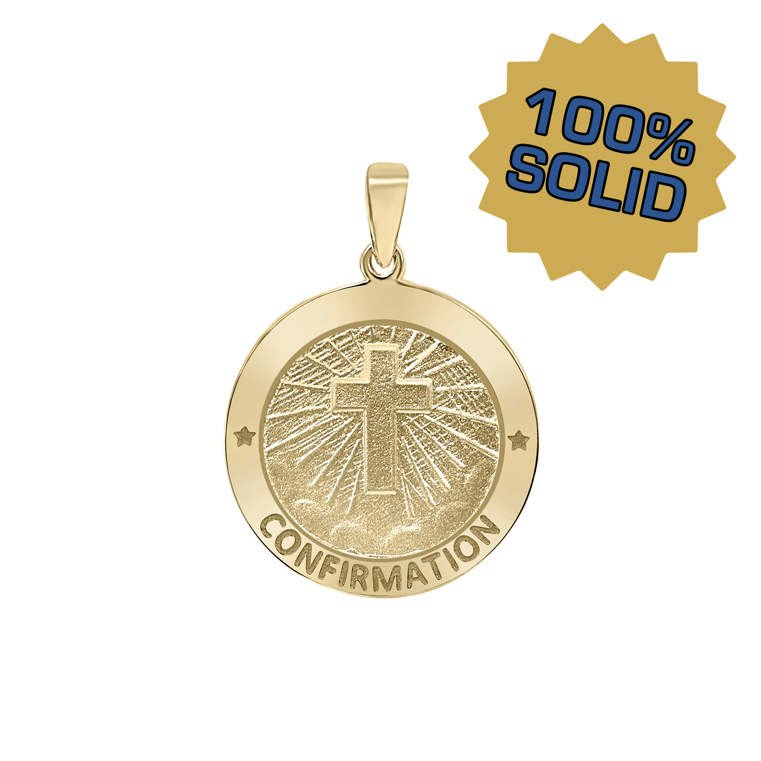 Unser Firmungsmedaillon mit Kreuz (Confirmación) aus 14-karätigem Gelbgold ist ein kostbares katholisches Schmuckstück, das an das Sakrament der Firmung erinnert. Dieser runde Medaillonanhänger besticht durch seine detailreiche Verarbeitung aus feinem Gold und zeigt ein Kreuzmotiv, das diesen heiligen Meilenstein würdigt. Er ist ein wertvolles Erbstück für Firmlinge, Firmpaten oder katholische Jugendliche.