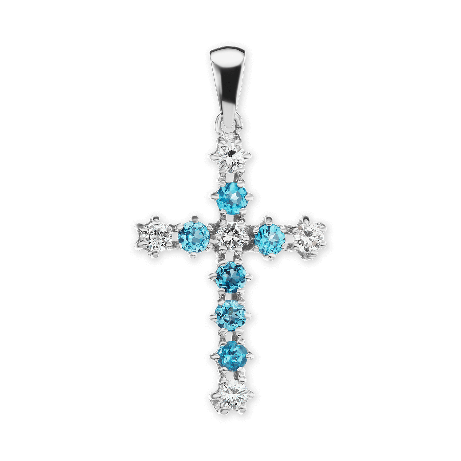 Moderner Kreuzanhänger mit Diamanten und blauen Topasen in 14-karätigem Weißgold
