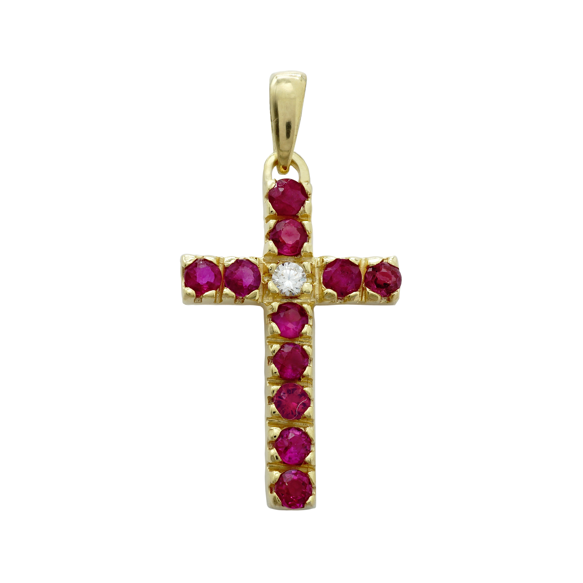 Klassischer Kreuzanhänger mit Diamanten und Rubinen in 14-karätigem Gelbgold