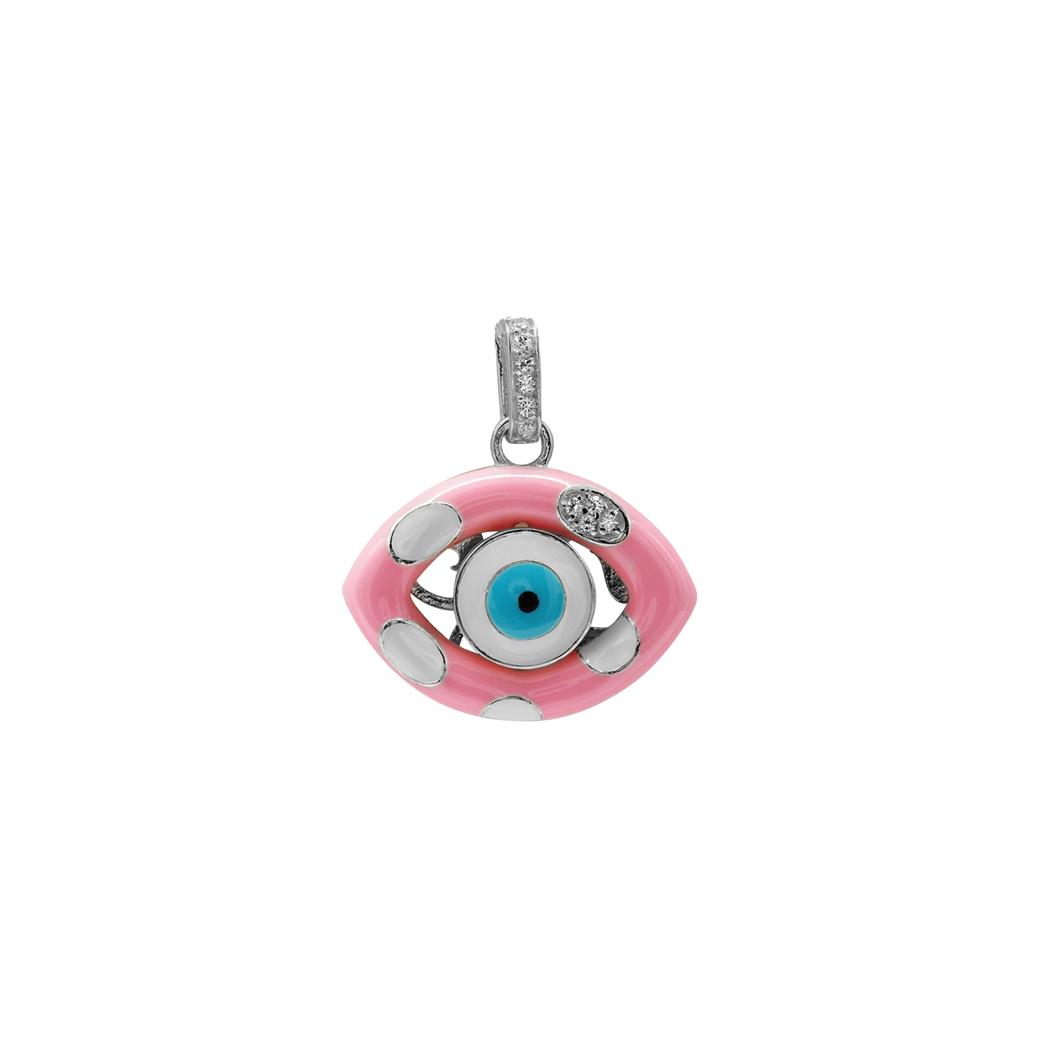 Anhänger mit bösem Blick, verziert mit rosa und weißer Emaille, aus Sterlingsilber