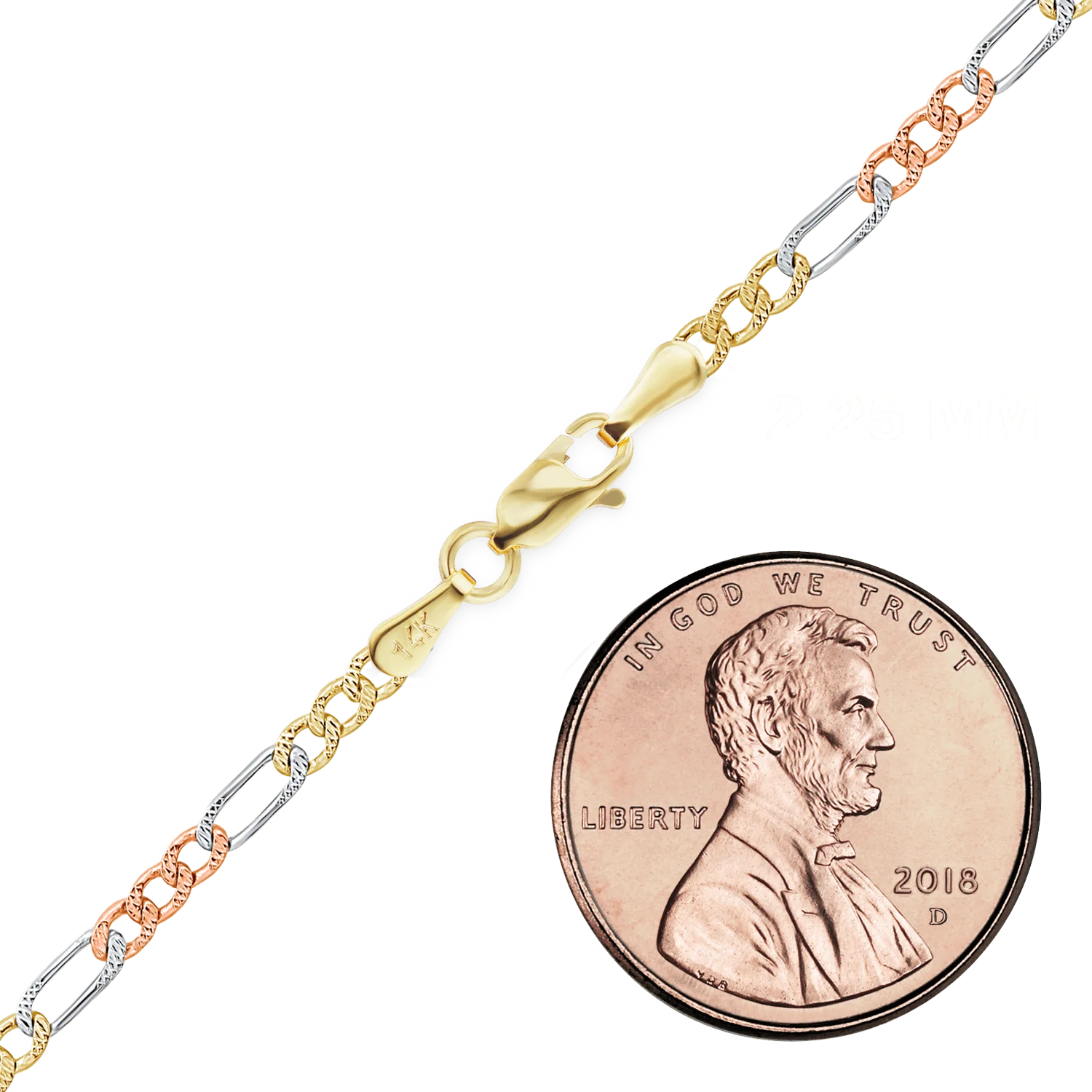 Unser klassisches Figaro-Armband aus 14-karätigem Gold in Tri-Color verkörpert zeitlose Schönheit und meisterhafte Handwerkskunst. Ausgewogenes Gewicht und eine glatte Oberfläche sorgen für angenehmen Tragekomfort den ganzen Tag. Polierte Glieder fangen das Licht ein und verleihen dem Armband einen edlen, luxuriösen Look. Es ist so gestaltet, dass es sich mühelos sowohl zu alltäglichen als auch zu eleganten Outfits kombinieren lässt.