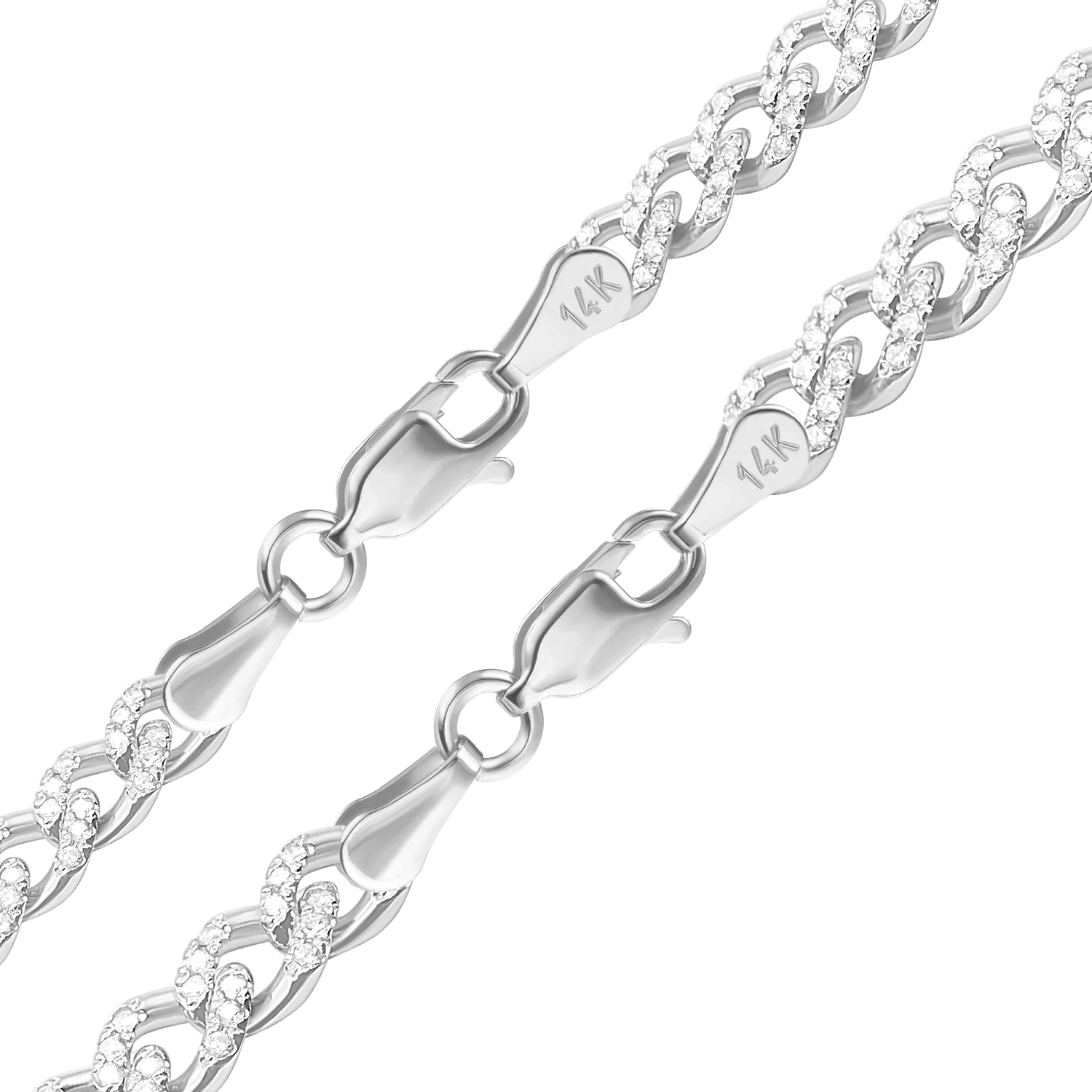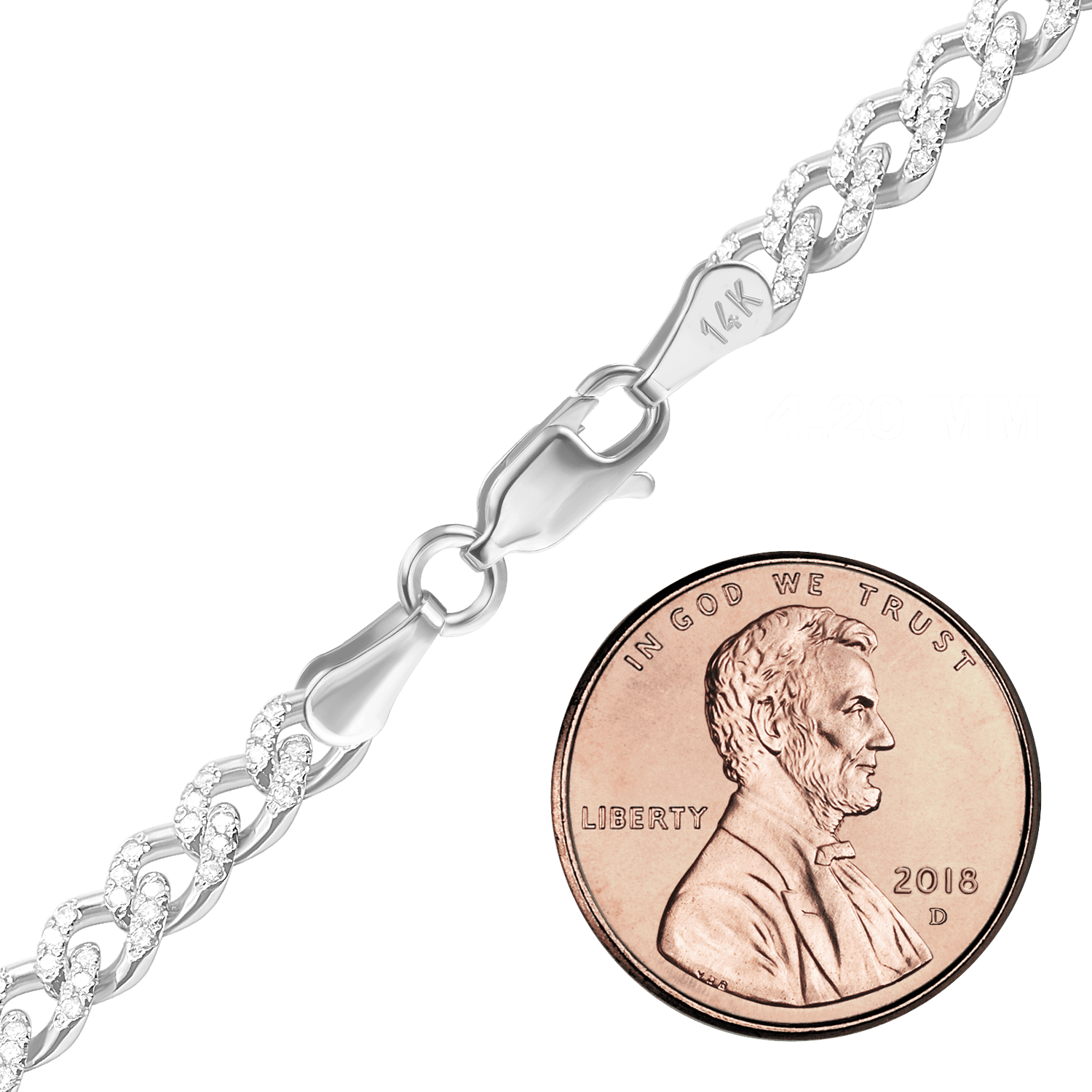 Dieses aus massivem 14-karätigem Weißgold gefertigte und mit echten Naturdiamanten besetzte Pavé-Armband verkörpert die höchste Kunstfertigkeit im Bereich der Schmuckherstellung. Die Naturdiamanten sind von VS-Reinheit und nahezu farblos. Sie wurden von Hand in einer sicheren Pavé-Fassung gesetzt, die maximales Funkeln ermöglicht und gleichzeitig die elegante, raffinierte Silhouette des Panzerketten-Designs bewahrt.