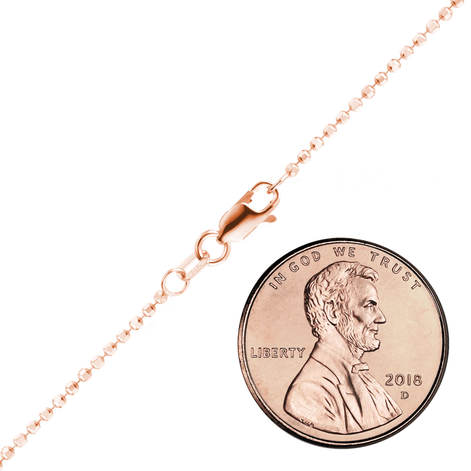 Das Armband mit diamantgeschliffenen runden Perlen aus 14-karätigem Roségold besticht durch seine facettierten, diamantgeschliffenen Oberflächen. Jede Perle ist präzise geschliffen, wodurch zahlreiche reflektierende Flächen entstehen, die das Licht einfangen und streuen und dem Armband im Vergleich zu glatten Perlen zusätzlichen Glanz verleihen.