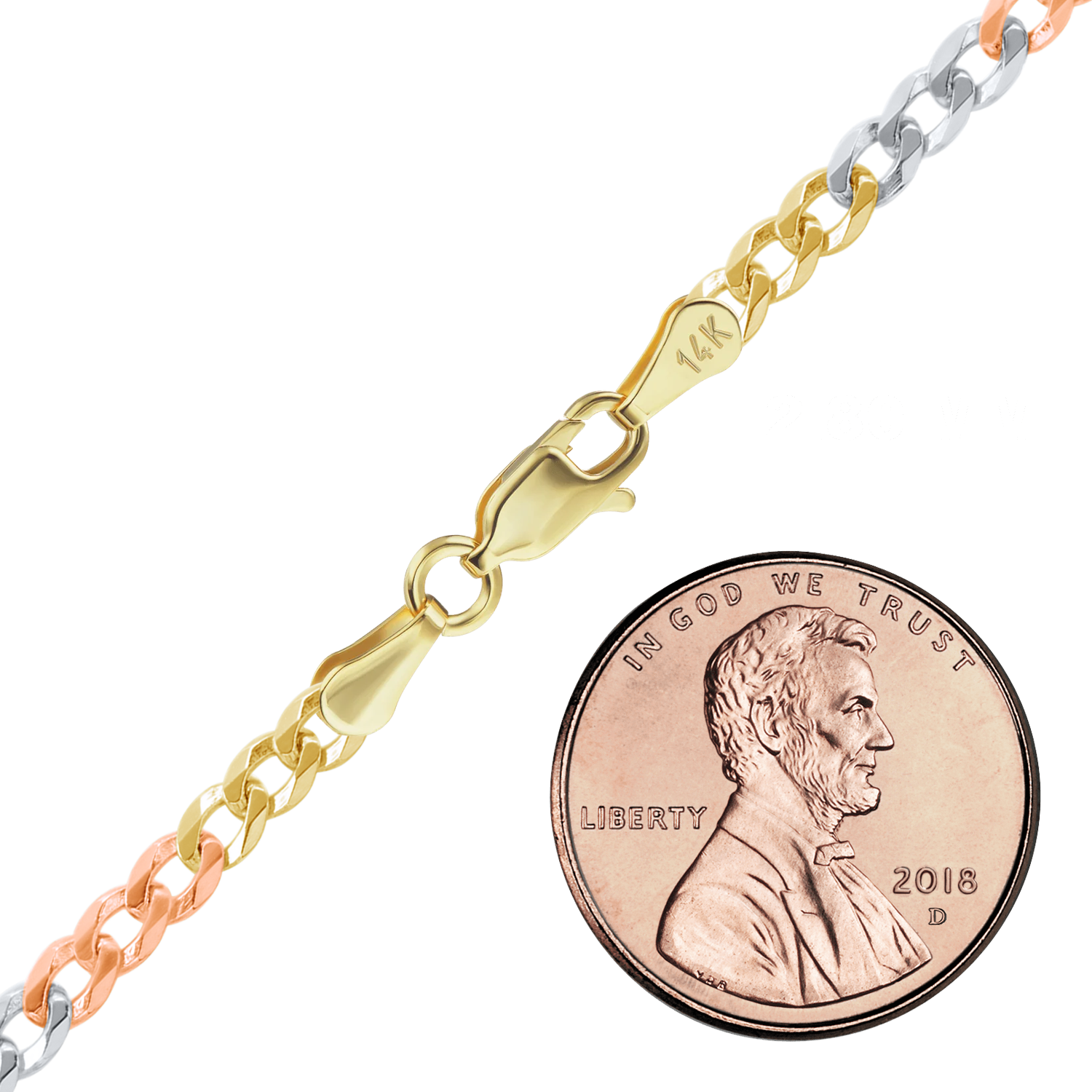 Setzen Sie ein luxuriöses Statement mit dieser zarten Panzerkette aus 14-karätigem Dreifarbengold. Dieses exquisite Schmuckstück besticht durch abwechselnd angeordnete Glieder in Gelb-, Weiß- und Roségold, die eine atemberaubende Optik und raffinierte Eleganz mit dreifachem Glanz erzeugen.