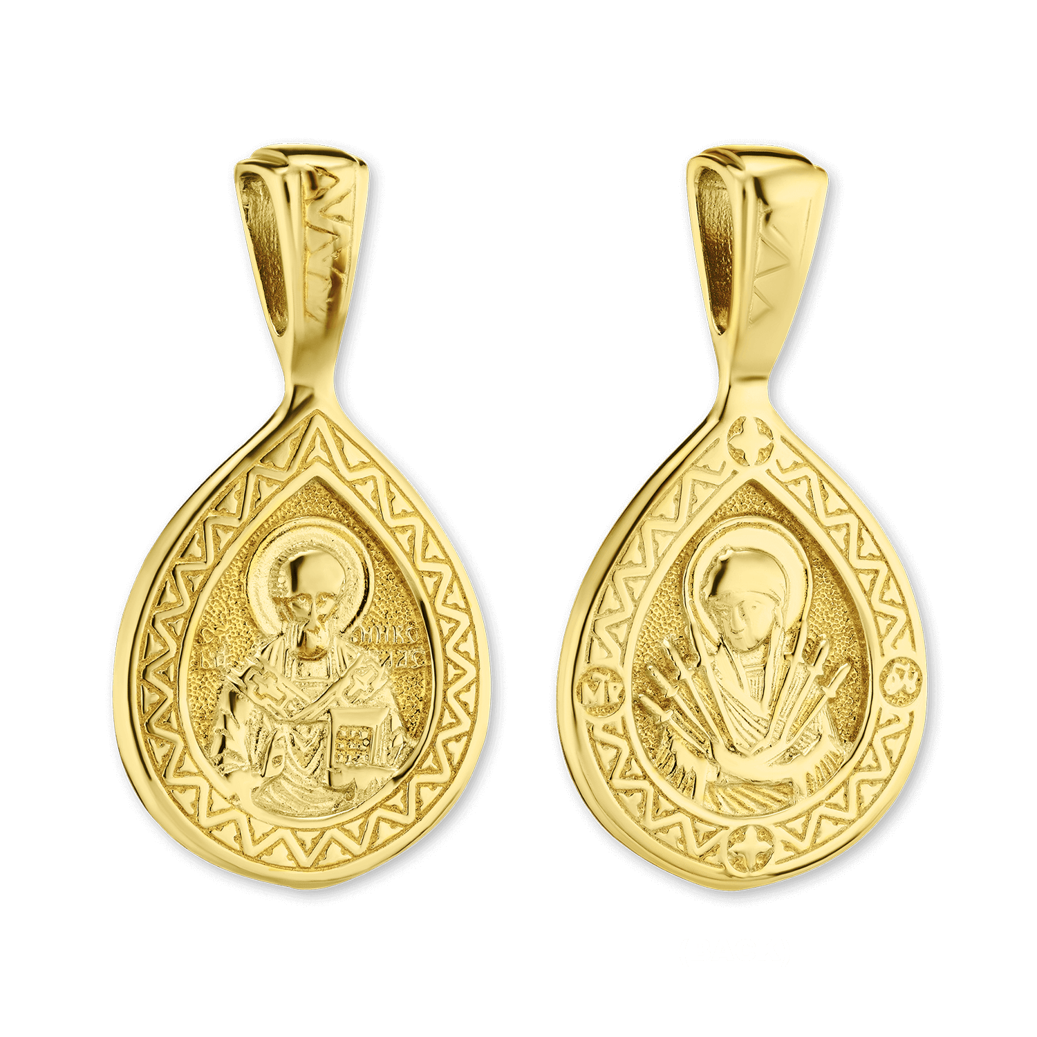 Doppelseitiger byzantinischer Anhänger „Maria und die Schwerter“ aus Sterlingsilber, veredelt mit 14-karätigem Gelbgold