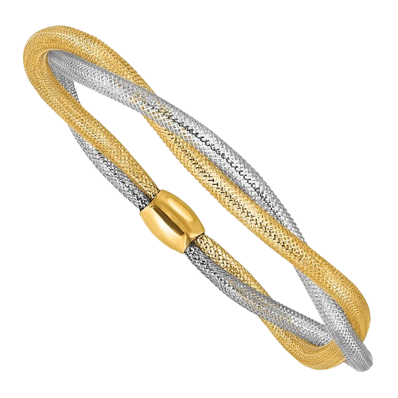 Dieses exquisite, zweifarbige 14-Karat-Armband vereint auf wunderschöne Weise die Wärme von Gelbgold mit dem strahlenden Glanz von Weißgold. Es wird in Italien in traditioneller Flechttechnik gefertigt und besticht durch sein gedrehtes Design, das eine faszinierende Dynamik und Tiefe erzeugt, während die polierte Oberfläche das Licht aus jedem Winkel einfängt. Die flexible Konstruktion garantiert ganztägigen Tragekomfort ohne Kompromisse bei der Eleganz.