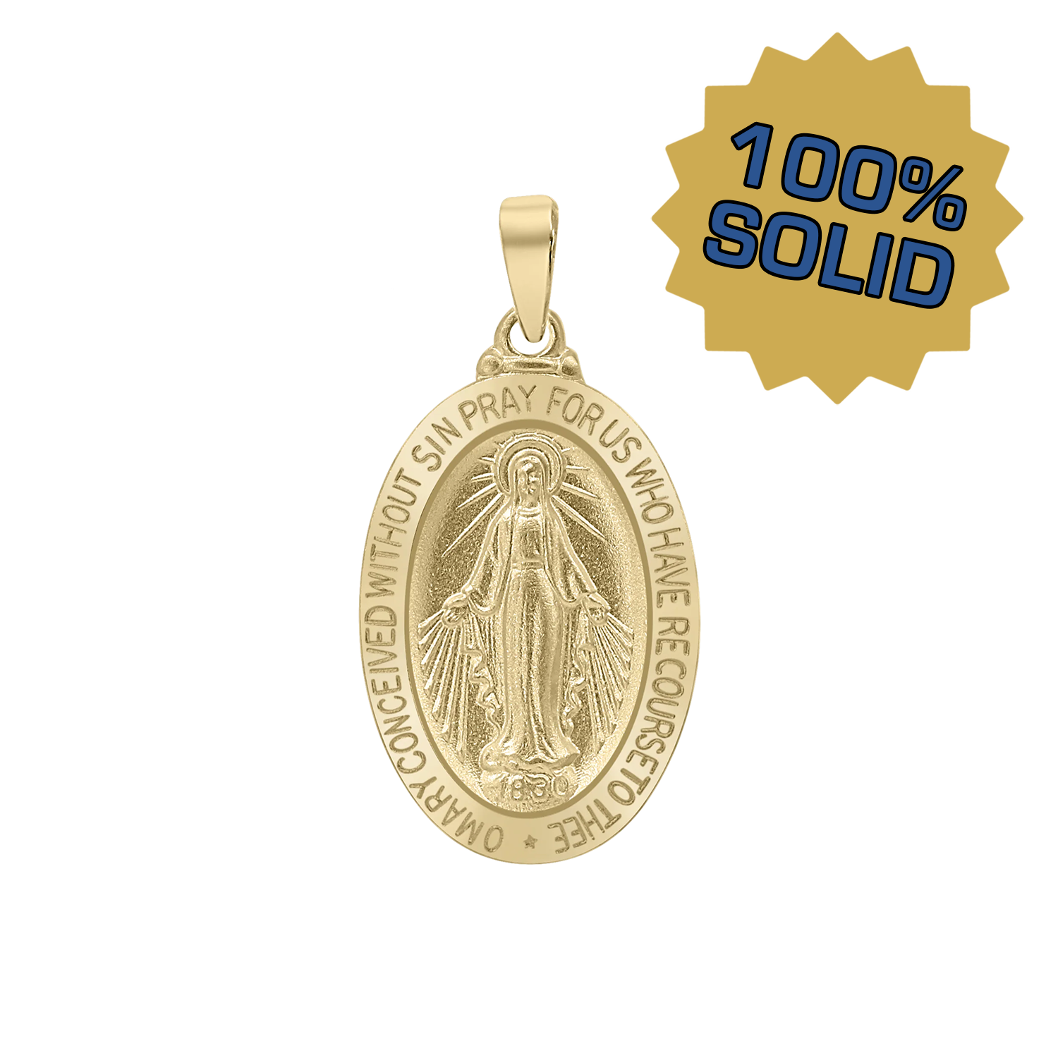 Unser ovales Wundermedaillen-Medaillon aus 14-karätigem Gelbgold ist ein heiliges katholisches Schmuckstück, das an die Marienerscheinung vor der heiligen Katharina Labouré erinnert. Dieser ovale Medaillon-Anhänger besticht durch wunderschön detaillierte Marienmotive in edlem Gold und ist somit ein wertvolles Erbstück für alle, die der Wundermedaille verbunden sind, Marias Schutz suchen oder den katholischen Glauben leben.