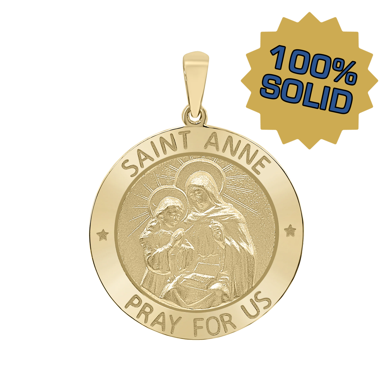 Unser Medaillon der Heiligen Anna (Santa Ana) aus 14-karätigem Gelbgold ist ein kostbares katholisches Schmuckstück zu Ehren der Mutter der Jungfrau Maria und Großmutter Jesu. Dieser runde Medaillonanhänger besticht durch seine detailreiche Verarbeitung in feinem Gold und ist ein bedeutungsvolles Erbstück für Großmütter, Mütter oder alle, die dieser geliebten Matriarchin verbunden sind.