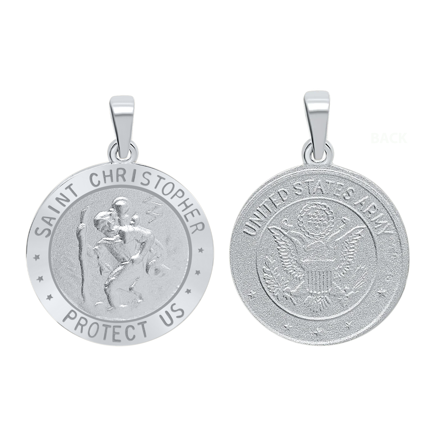 Unser St.-Christophorus-Armee-Medaillon (San Cristóbal) aus Sterlingsilber ist ein ausdrucksstarkes katholisches Schmuckstück zu Ehren des Schutzpatrons der Reisenden und Soldaten. Dieser runde Medaillon-Anhänger besticht durch seine detailreiche Verarbeitung mit Armeeabzeichen aus feinem Sterlingsilber und ist ein wertvolles Erbstück für Angehörige der Armee, Soldaten oder alle, die sich eine sichere Reise wünschen.