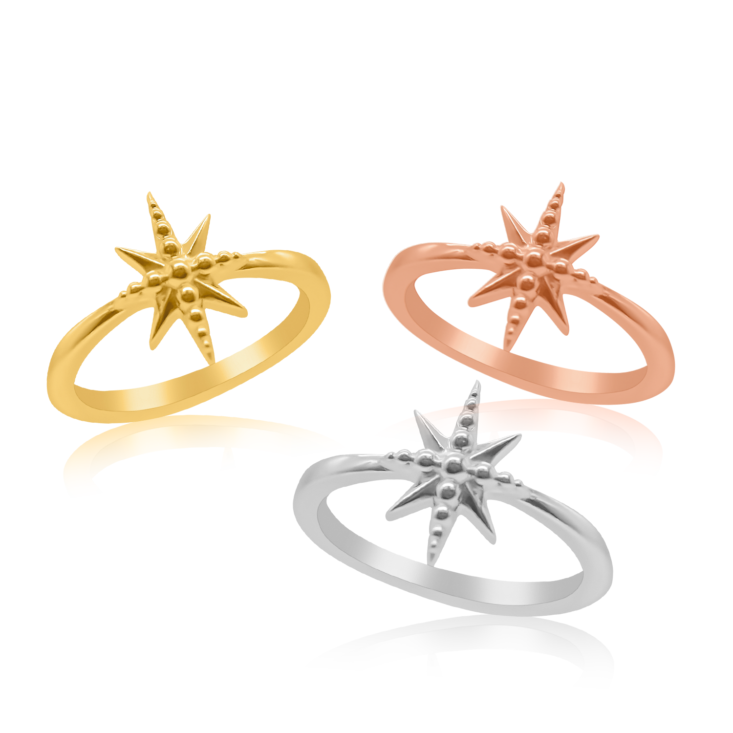 Der Ring „Dotted Star“ präsentiert einen himmlischen Stern, der von zarten Punkten in 14-karätigem Gold umrandet ist. Dieses verspielte Schmuckstück fängt das Funkeln des Sternenlichts mit seiner dezenten Punktstruktur ein. Die offene Sternform verleiht dem Ring eine luftige, moderne Ästhetik und eignet sich perfekt zum Kombinieren mit anderen Ringen oder zum Solo-Tragen.