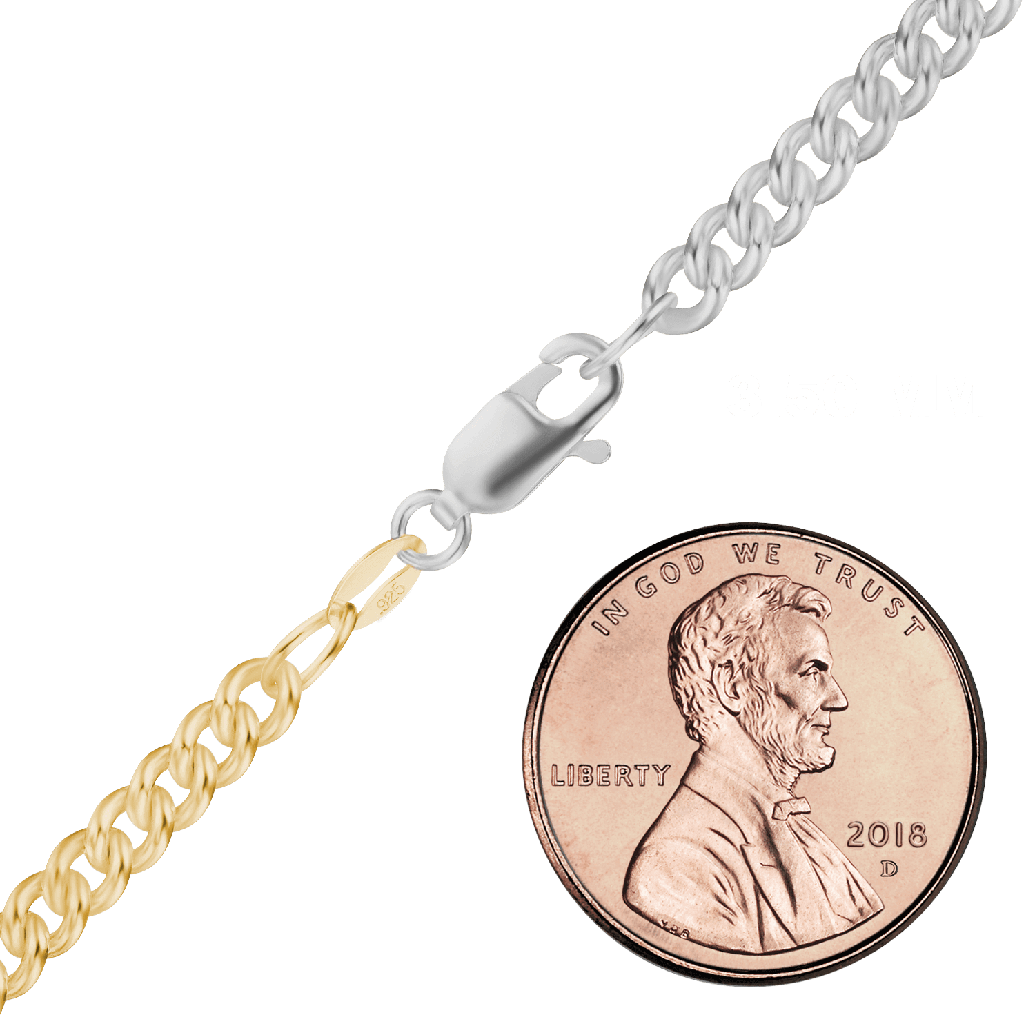 Make a sophisticated statement with this Medium Round Curb Anklet in Sterling Silver with 18K Yellow Gold Two Tone Finish. This distinctive piece features medium round curb links with alternating yellow gold and rhodium plating that create striking visual contrast and contemporary elegance with dual brilliance.