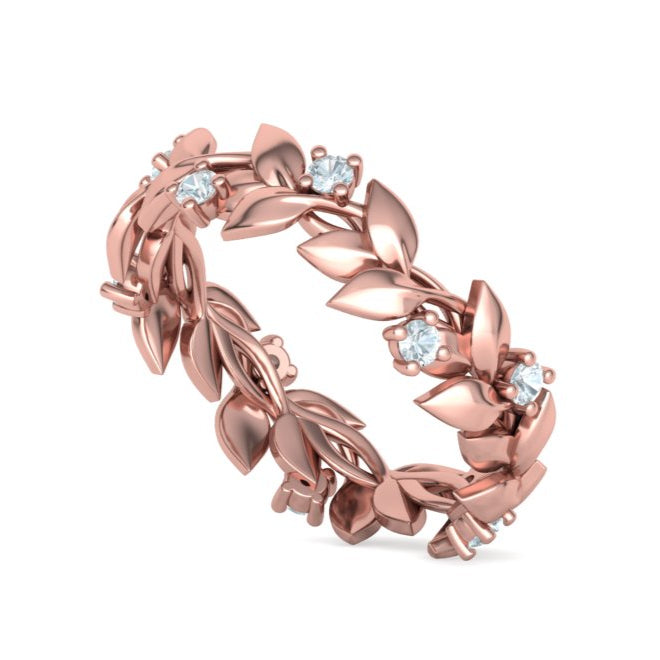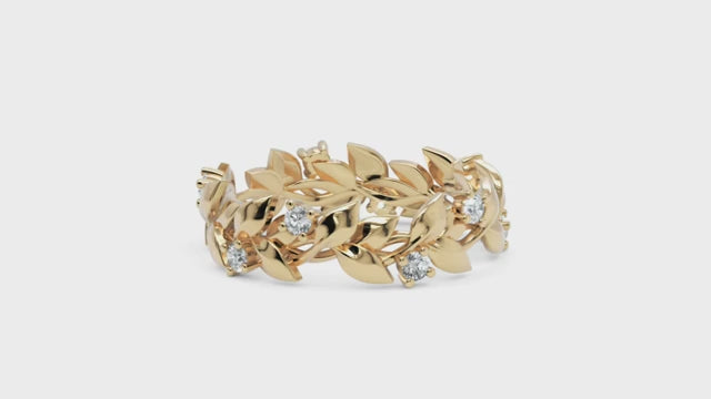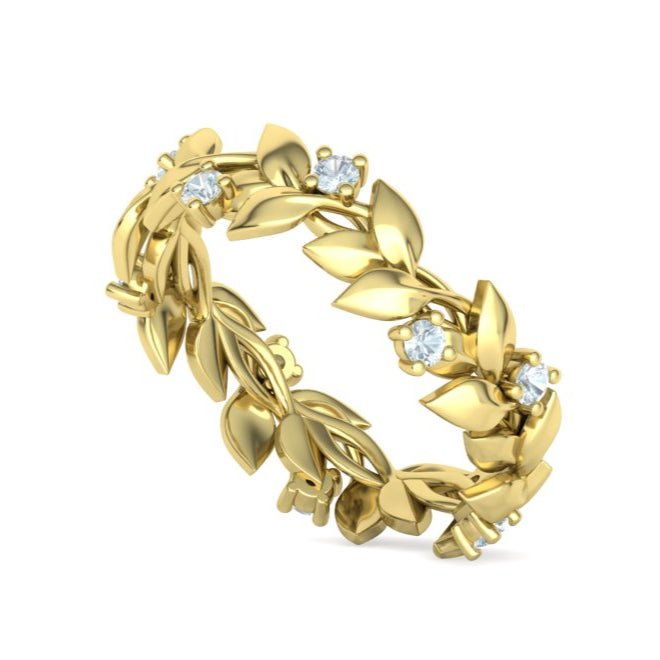 A nature-inspired eternity band handcrafted with delicate artistry. Sculpted gold leaves intertwine with brilliant round diamonds in a graceful, organic loop.